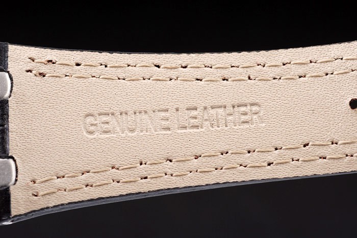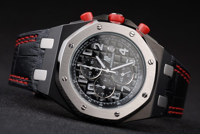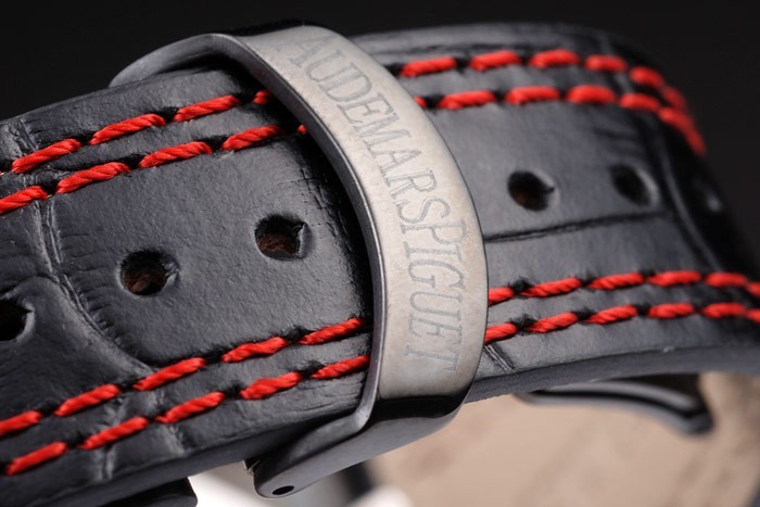 Bracelet: Heat embossed Audemars Piguet black crocodile leather strap with double red stitching and Audemars Piguet engraved ion-plated fold-in clasp