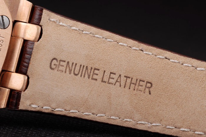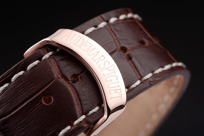 Bracelet: Heat embossed Audemars Piguet brown crocodile leather strap with Audemars Piguet engraved rose-gold plated fold-in clasp