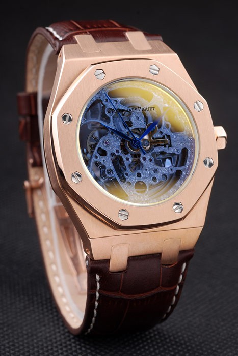 Back: Royal Oak engraved rose-gold plated screwed down back with transparent centre revealing inner mechanics