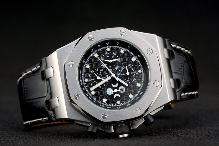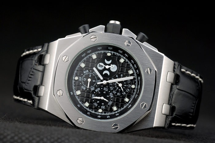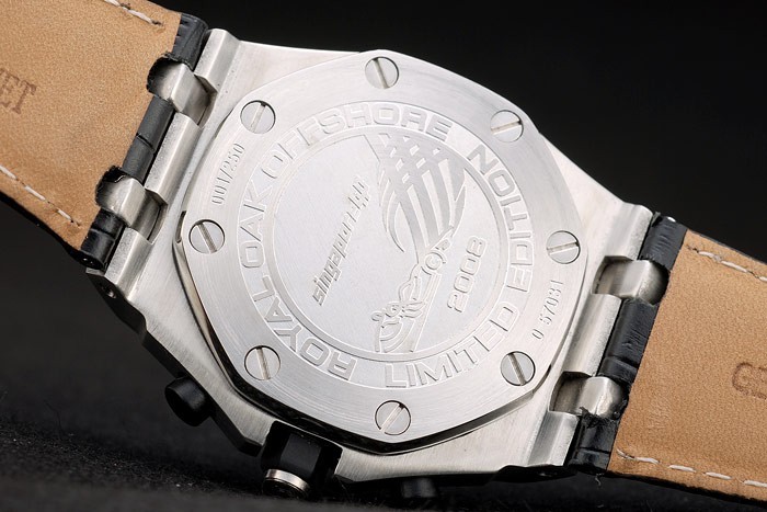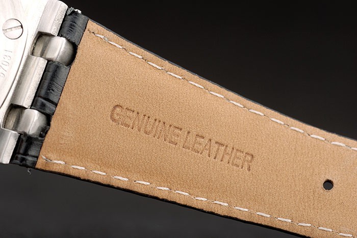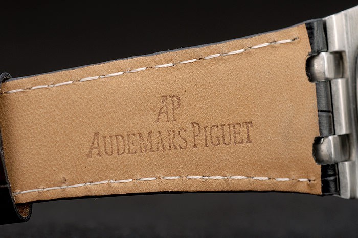 Bracelet: Audemars Piguet heat embossed black crocodile leather strap with Audemars Piguet engraved polished stainless steel hidden hook clasp