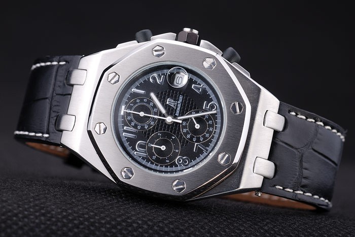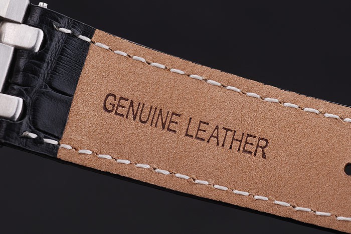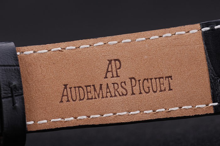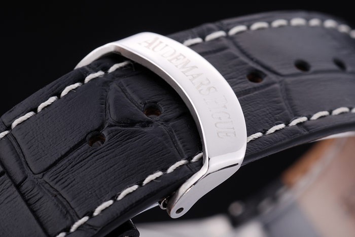 Bracelet: Black crocodile leather strap with white thread stitching and heat embossed Audemars Piguet name and logo and an Audemars Piguet inscribed stainless steel flip-over hook clasp