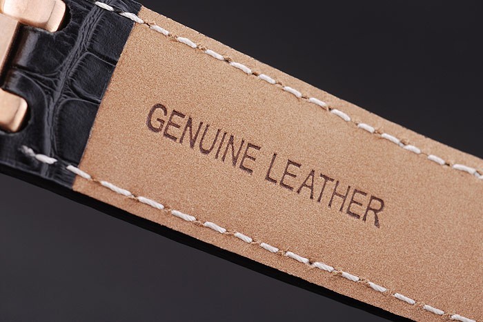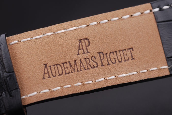 Bracelet: Black crocodile leather strap with white thread stitching and heat embossed Audemars Piguet name and logo and an Audemars Piguet inscribed rose-gold plated flip-over hook clasp
