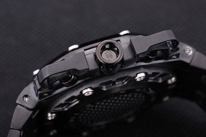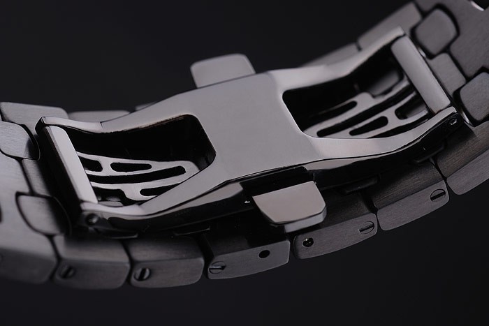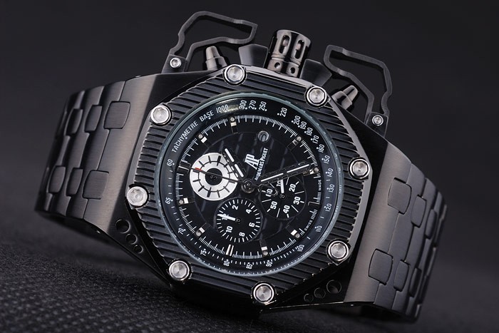 Crown: Audemars Piguet logo engraved encased ion-plated crown with two protected small push-button crowns on either side of it