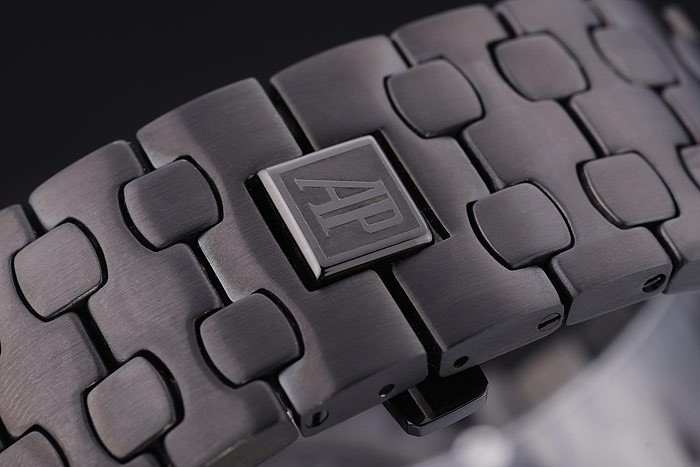 Bracelet: Ion-plated stainless steel link bracelet with Audemars Piguet logo inscribed tiny fold-over push release clasp