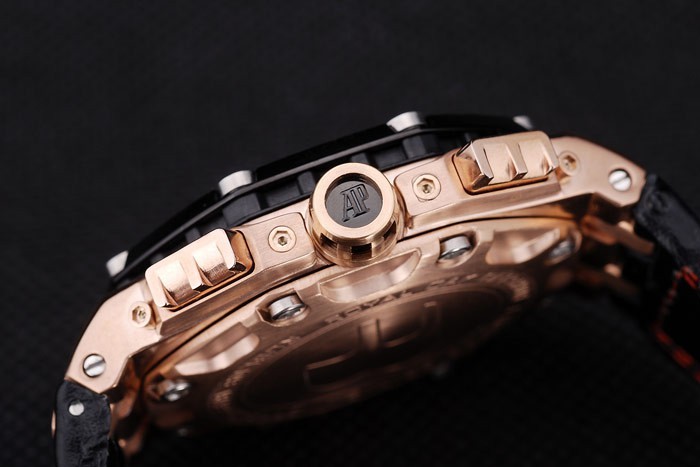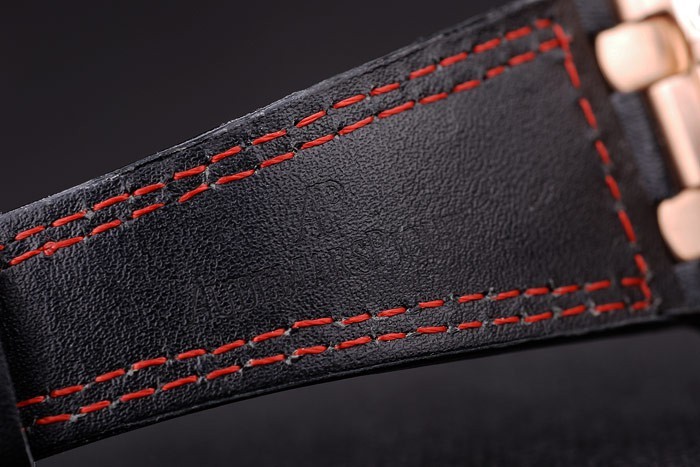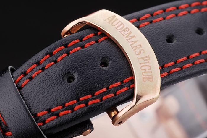 Bracelet: Heat embossed Audemars Piguet Swiss Made and logo black leather strap with double red thread stitching and Audemars Piguet engraved rose-gold plated hook-buckle clasp