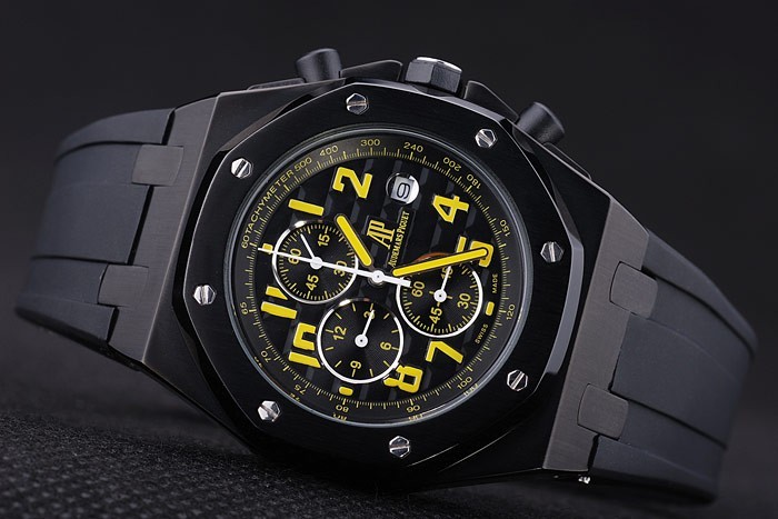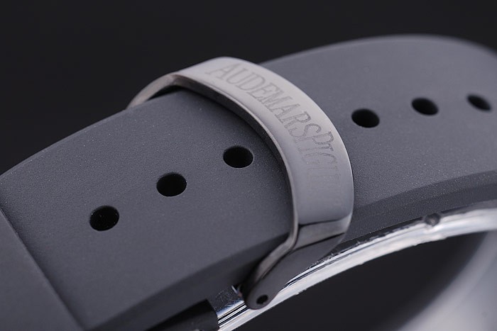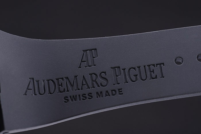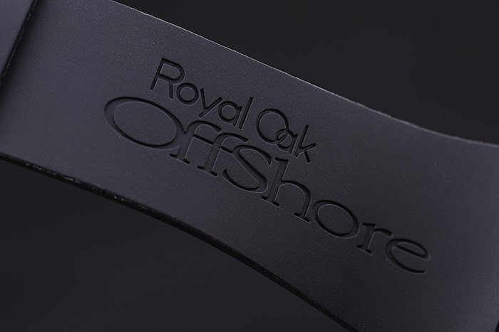 Bracelet: Black rubber strap with heat embossed Audemars Piguet Royal Oak Offshore stamp and an Audemars Piguet inscribed ion-plated hook-buckle clasp