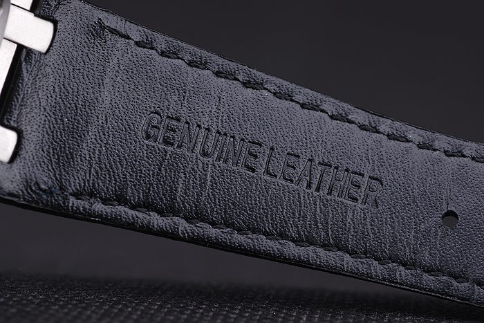 Bracelet: Black crocodile leather strap with white thread stitching and heat embossed Audemars Piguet name and logo and an Audemars Piguet inscribed stainless steel flip-over hook clasp