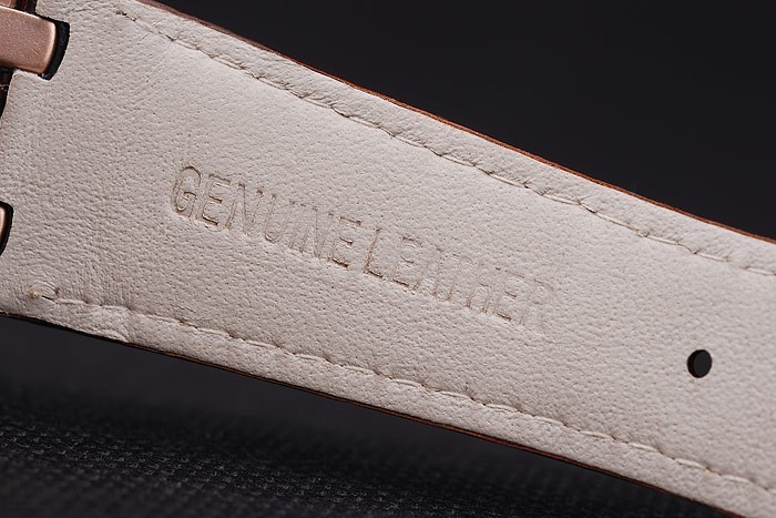 Bracelet: Brown crocodile leather strap with white thread stitching and heat embossed Audemars Piguet name and logo and an Audemars Piguet inscribed rose-gold plated flip-over hook clasp