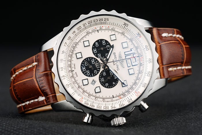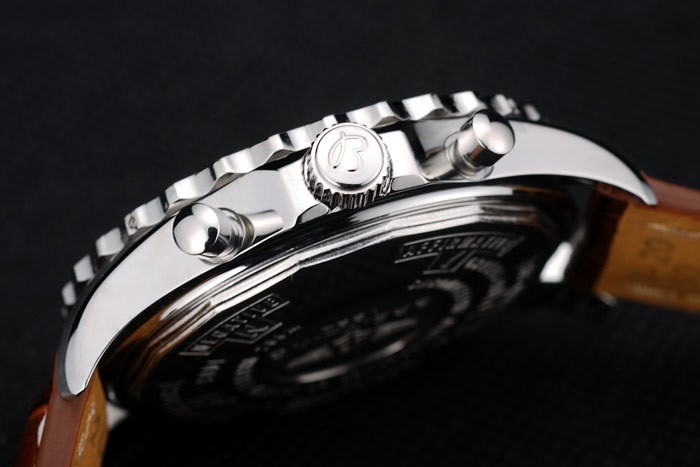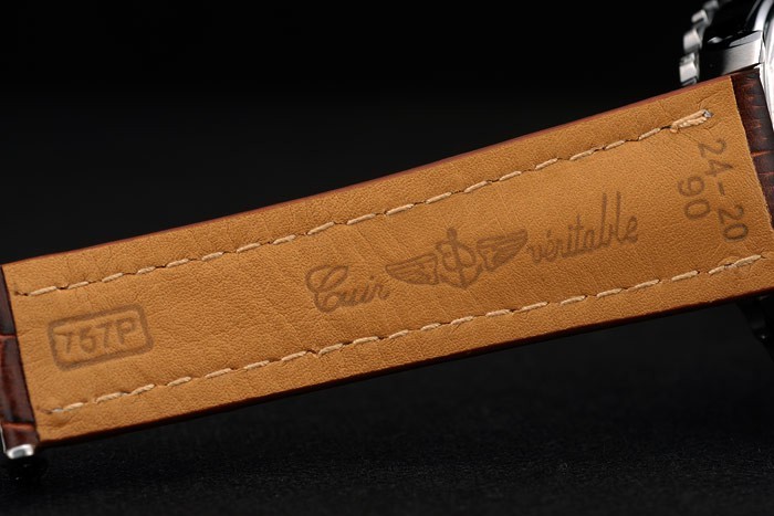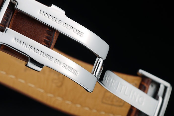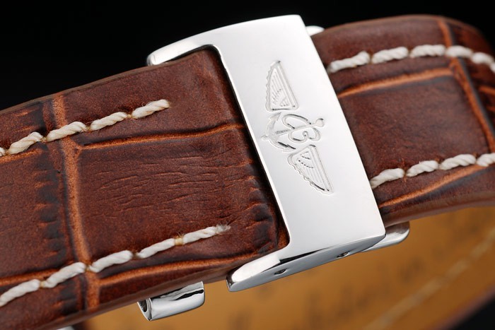 Bracelet: Heat embossed Breitling name and logo brown crocodile leather strap with white thread stiching and logo engraved stainless steel fold-in clasp