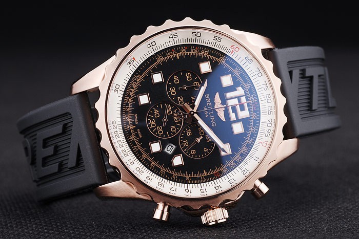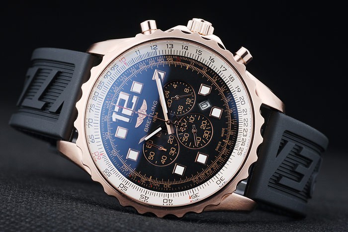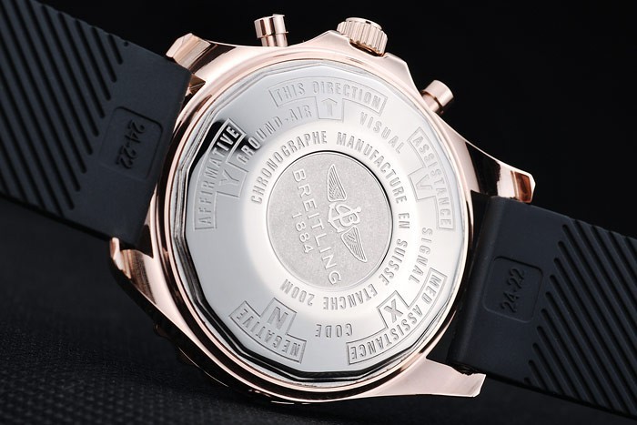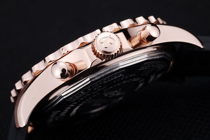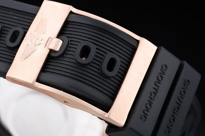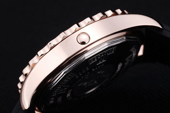 Bracelet: Black rubber strap with Breitling logo engraved rose-gold plated hook-buckle clasp