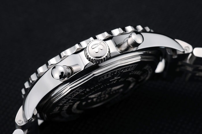 Crown: Polished stainless steel cutwork crown with Breitling logo and two smaller stainless steel push-button crowns on either side of it