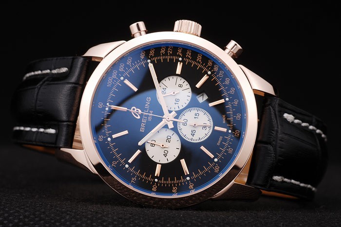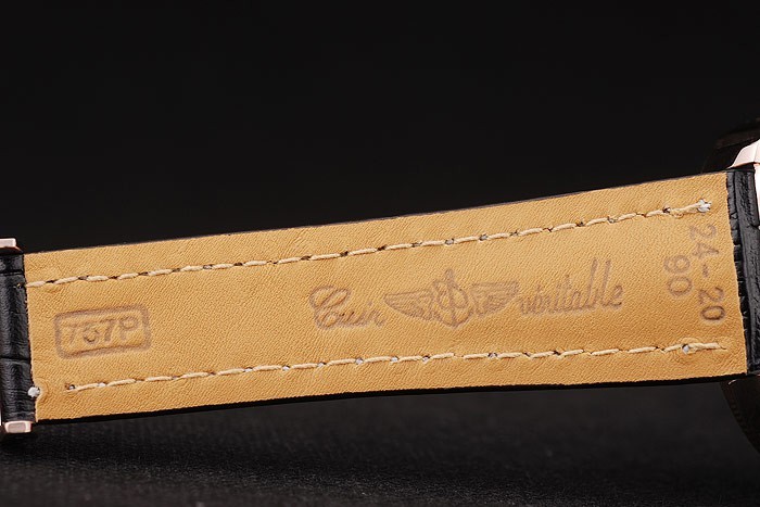 Bracelet: Heat embossed Breitling black crocodile leather strap with white thread stitching and a Breitling logo engraved fold-in rose-gold plated clasp