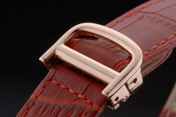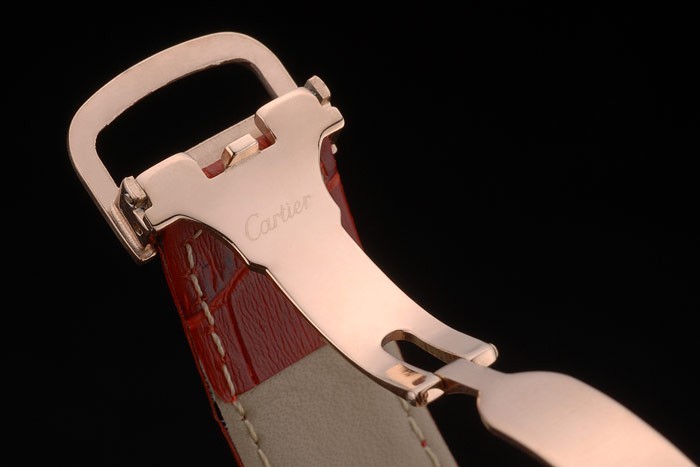 Bracelet: Cartier heat embossed red crocodile leather strap with 18k rose-gold plated fold-in buckle clasp