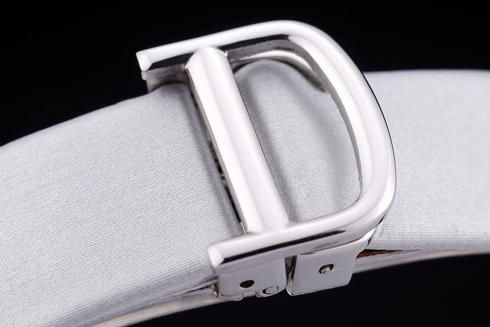 Bracelet: Heat embossed Cartier black textured leather strap with Cartier inscribed polished stainless steel fold-in flip clasp