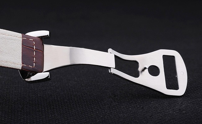 Bracelet: Brown crocodile leather strap with white stitching and Omega logo engraved stainless steel hook-buckle clasp