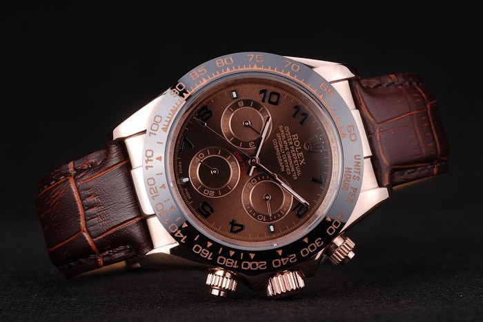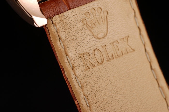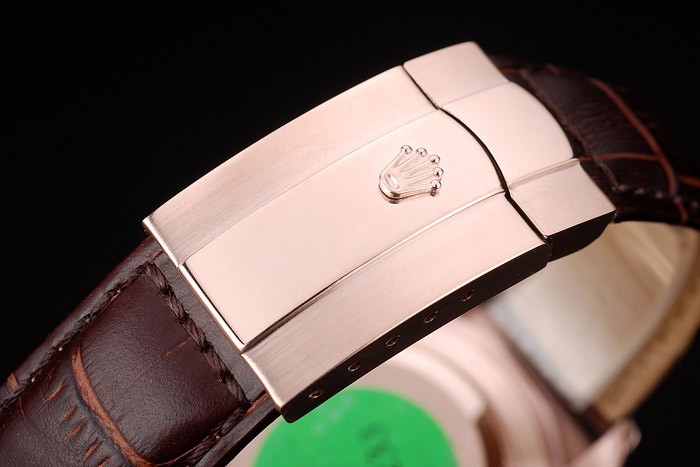 Bracelet: Rolex heat embossed brown crocodile leather strap with engraved rose-gold deployment clasp with Rolex logo on top