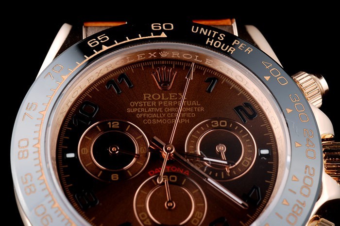 Crown: 18k rose-gold cutwork crown with Rolex logo and two smaller cutwork push button crowns on either side of it