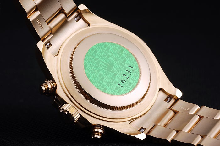 Back: Rose-gold push-in back with green Rolex logo stamp