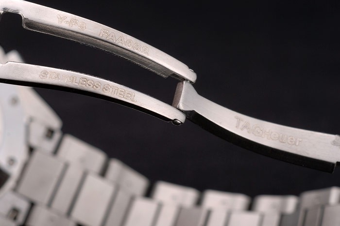Crown: Polished stainless steel cutwork crown with Tag Heuer logo and two long cutwork push button crowns on either side of it along with a cutwork crown on the opposite side