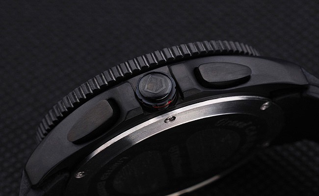 Crown: Ion-plated stainless steel cutwork crown with Tag Heuer logo plus two additional crowns on either side and one on the opposite top corner