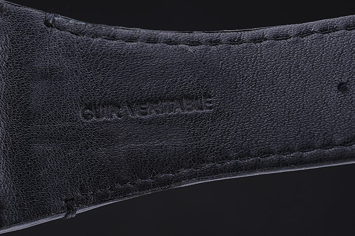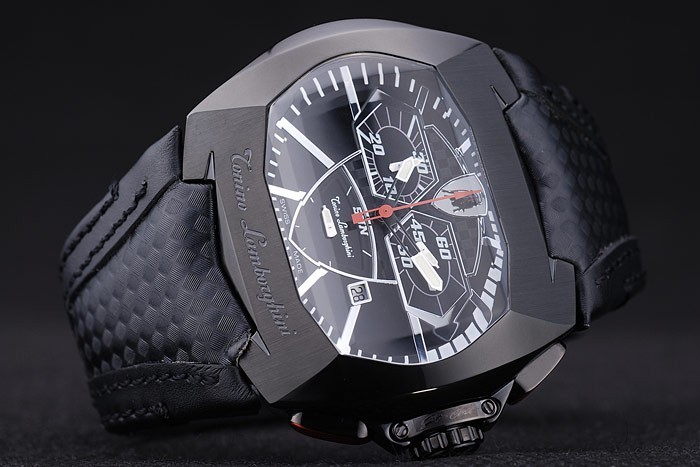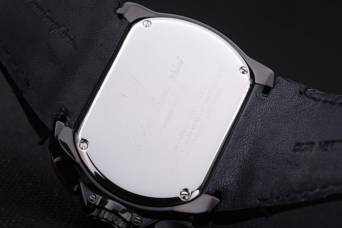 Bracelet: Black leather strap with heat embossed Tonino Lamborghini stamp and Tonino Lamborghini engraved and logo embossed ion-plated fold-in flip-over hook clasp