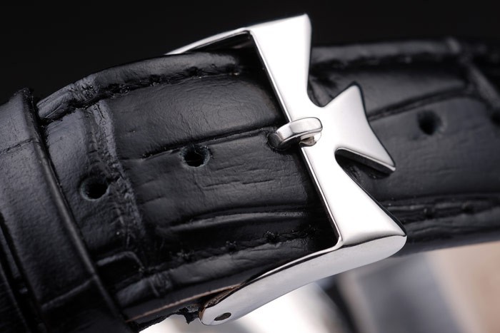 Bracelet: Black crocodile leather strap with heat embossed Vacheron Constantin stamp and polished stainless steel Vacheron Constantin logo hook-buckle clasp