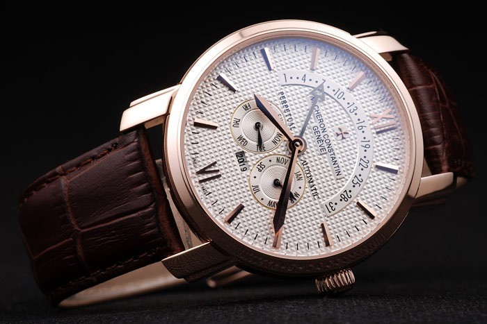 Bracelet: Brown crocodile leather strap with heat embossed Vacheron Constantin stamp and rose-gold plated Vacheron Constantin logo hook-buckle clasp